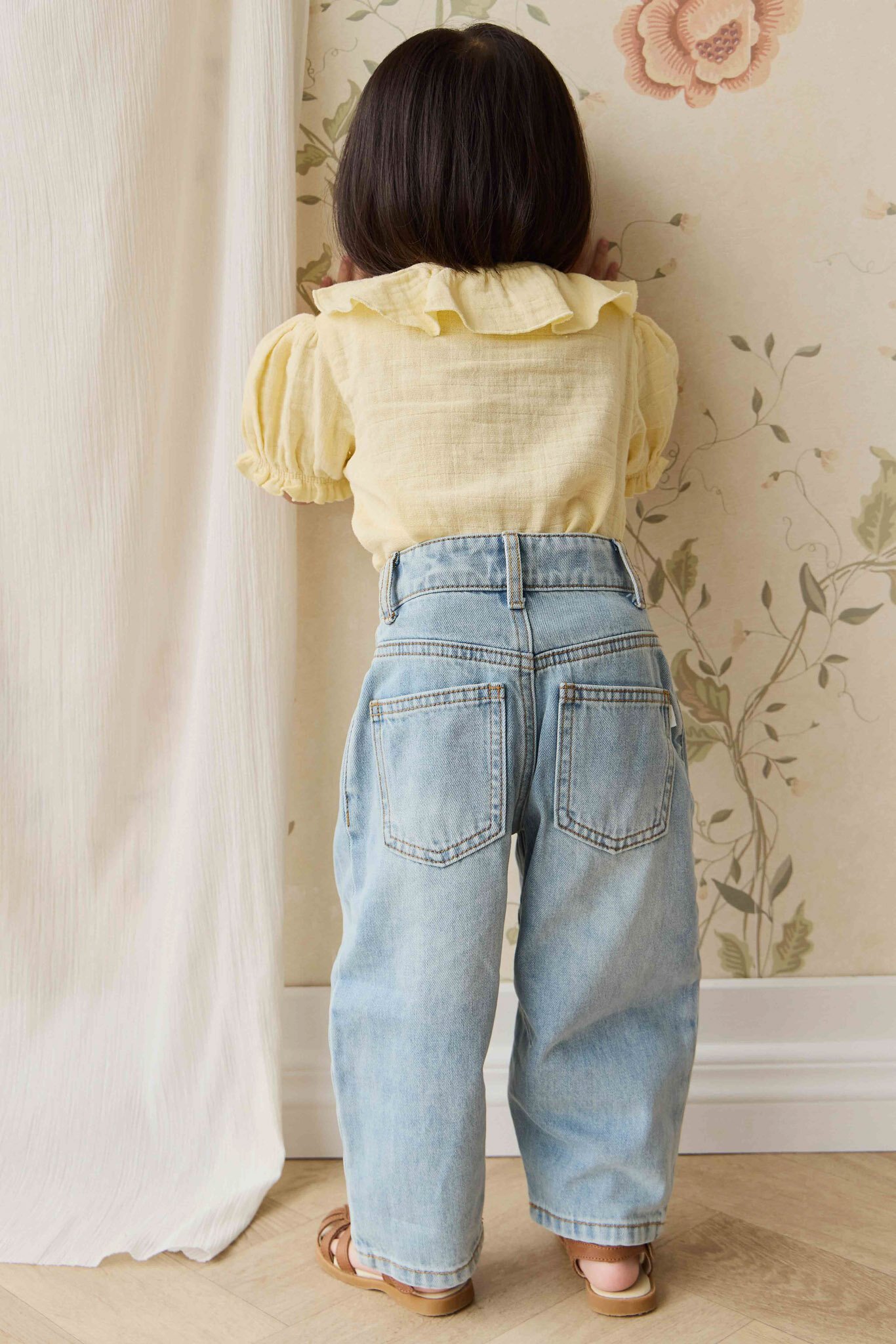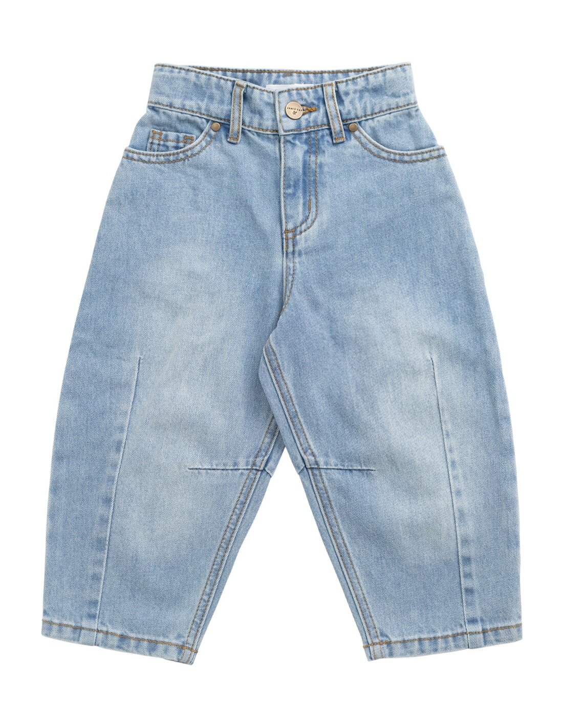 The high-waisted silhouette and soft cotton fabric provide ease of movement while keeping your child cozy. Finished with nickel-free metal accessories and a gentle antique blue wash, the Sierra Pant is a versatile barrel-style piece that pairs beautifully with any Jamie Kay top.