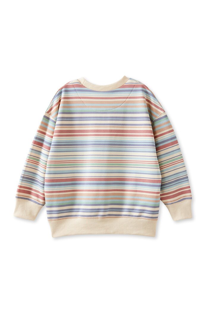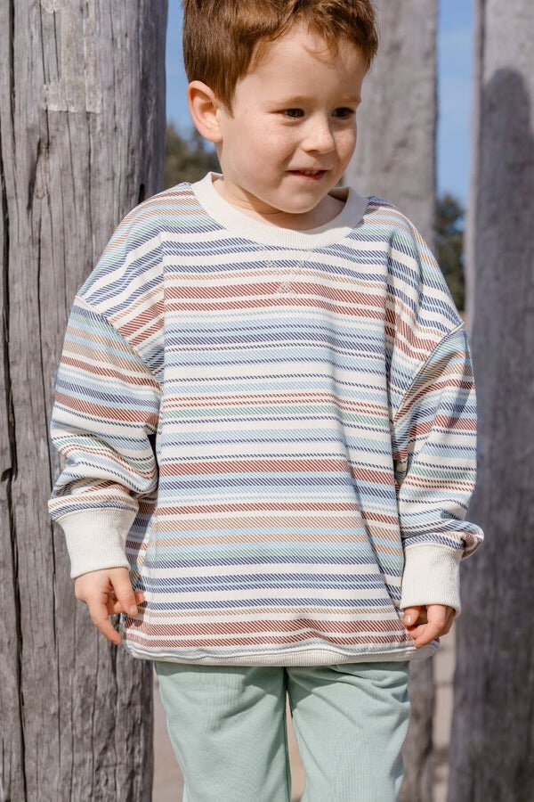 Milky Clothing’s Archie Sweat is a standout winter layer with a vintage twist. Featuring a off white base and all-over horizontal stripe print in earthy tones, it’s perfect for playdates or weekend exploring. Designed with a relaxed fit and cosy fleece lining, it brings comfort and colour to chilly days.
