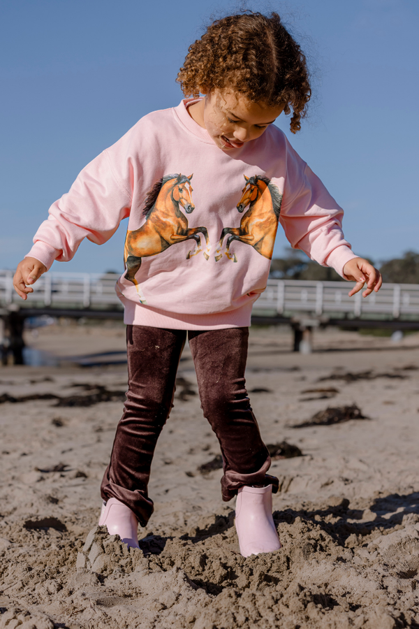 The Milky Expresso Velour Flares bring a bold pop of colour to cosy days. Crafted from soft, stretchy velour in a rich brown, these flares are warmer and thicker than standard leggings. Designed with an easy pull-on elastic waistband and a gentle flare from the knee, they’re comfy enough for play and stylish enough to dress up. Pair them with a tee or knit and you’re good to go!