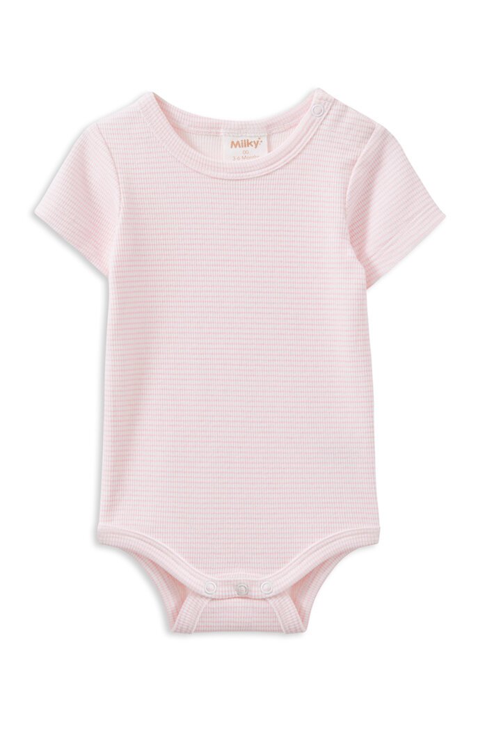Milky Pink Stripe Rib Bubbysuit. Your little one will be styling in this classic all-season staple! Our Bubbysuit is the perfect wardrobe must-have, with short sleeves for summer, and layering capability for when it gets cooler. Super versatile and comfy fabric ensures your little one stays cozy from playdates to bedtime. Available in many different colours, this garment promises durability, it's sure to become your go-to item that withstands wash after wash, promising longevity and continued comfort.