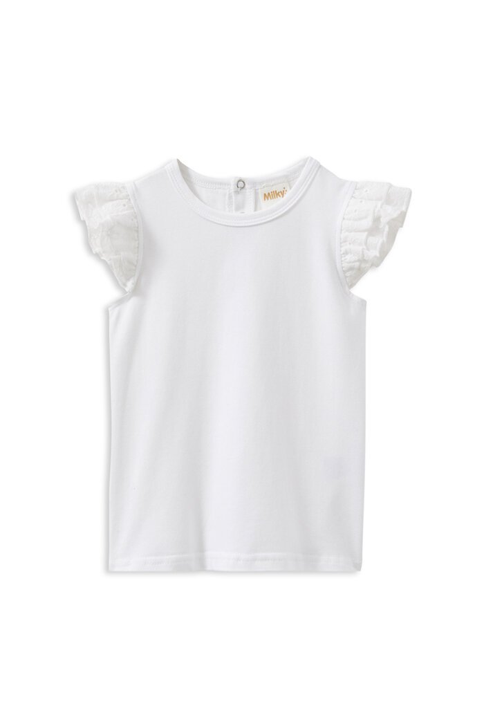 Milky White Broderie Frill Tee. A fresh twist on a classic, the White Broderie Frill Tee is a wardrobe staple with a pretty touch. This sweet tee features delicate broderie frill sleeves for a soft, feminine look while keeping things comfy for everyday wear. Perfect for dressing up or down, it pairs beautifully with skirts, shorts or layered under overalls a true all-rounder for warmer days.
