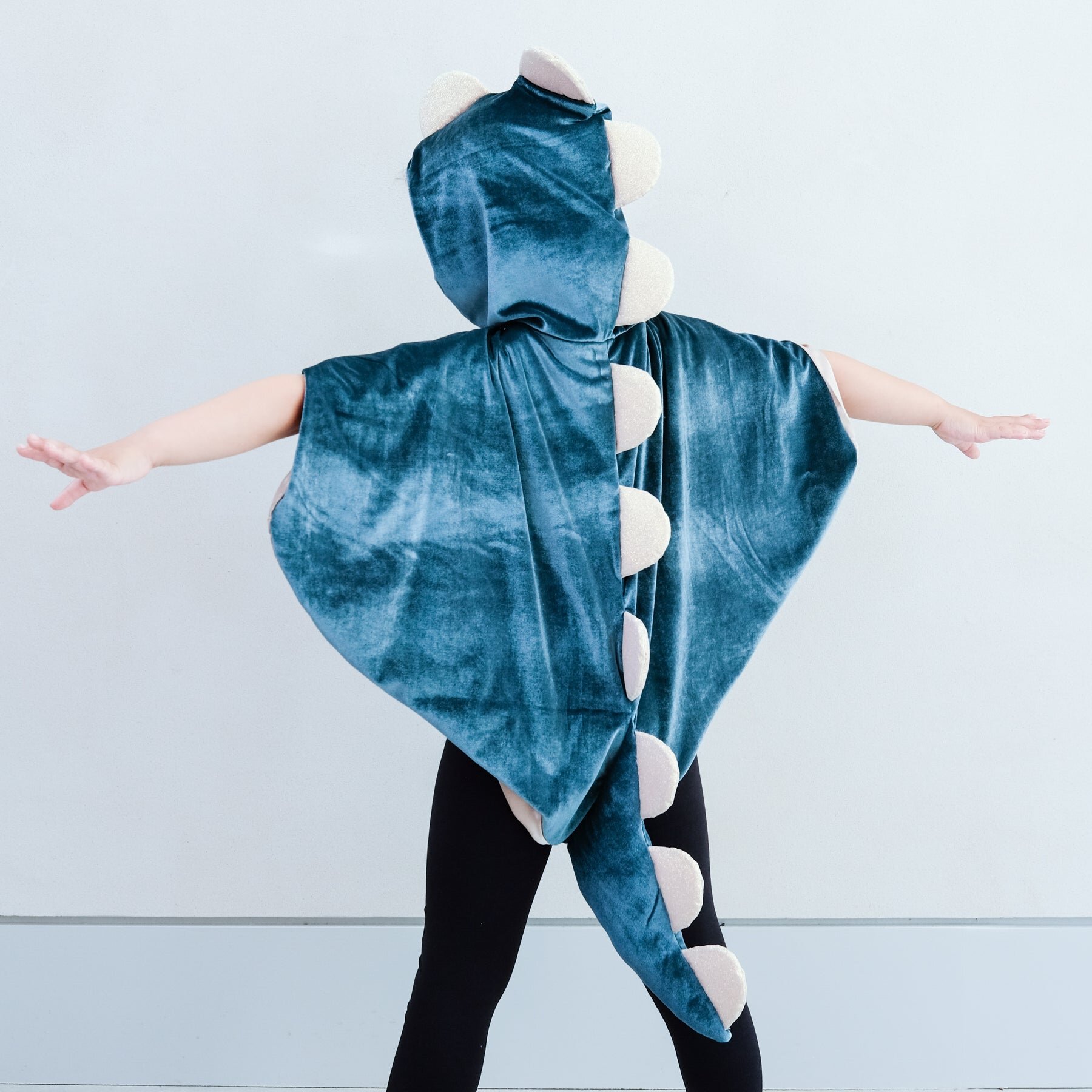 Crafted from deep green velvet fabric with gold satin lining and gold glitter scalloped 'spines' running from the hood to the tip of the tail