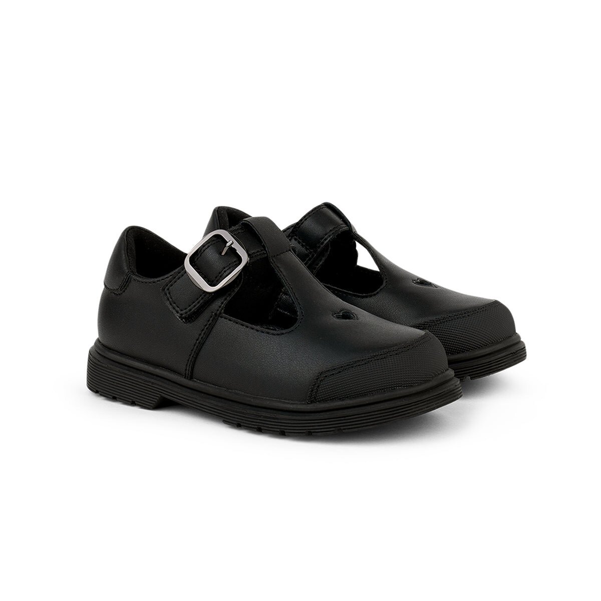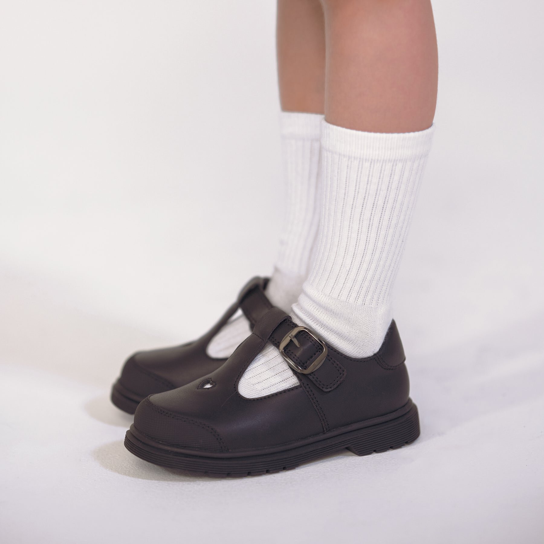 The Pretty Brave Athena is a classic girls T-bar school shoe with a timeless silhouette and thoughtful design. Featuring a heart cut-out on the vamp, reinforced rubber toe cap, ankle strap with black nickel buckle and hidden hook and loop fastening, Athena offers comfort, charm and a secure fit for everyday wear.