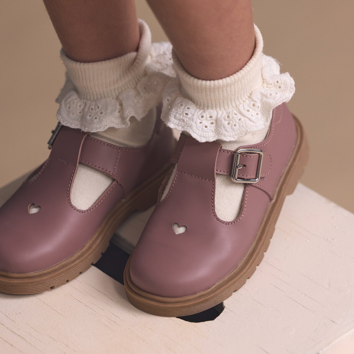For a sweet and practical T-bar shoe designed for comfort, style and everyday wear, girls will love the Maddison by Pretty Brave. Crafted from genuine leather with a heart cut-out detail and faux buckle, Maddison features an adjustable Velcro strap, padded ankle, and flexible rubber sole for a secure fit and freedom of movement.