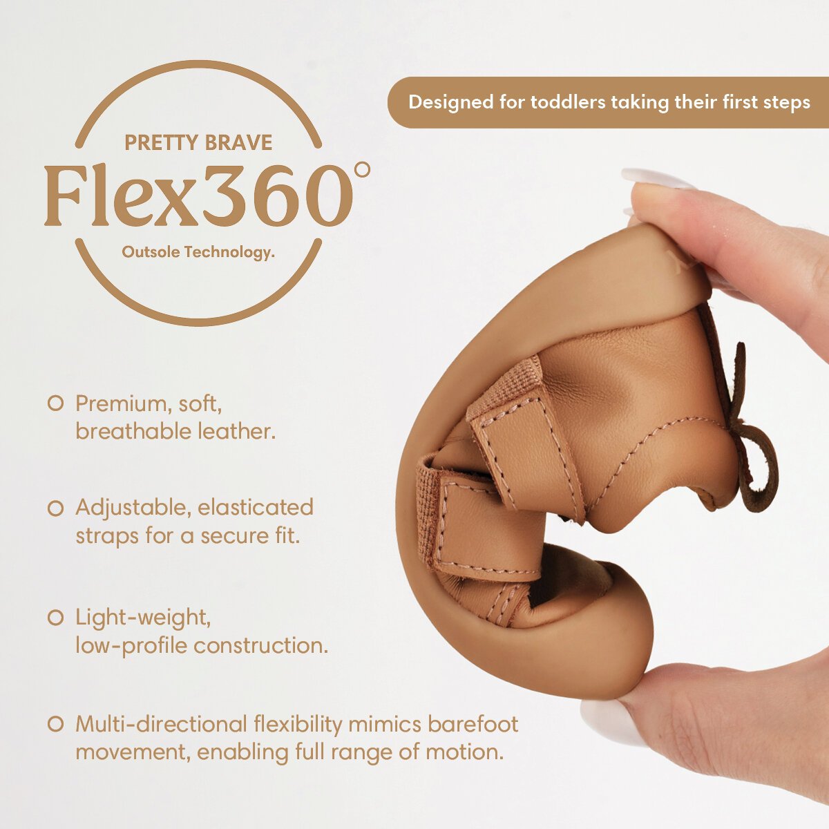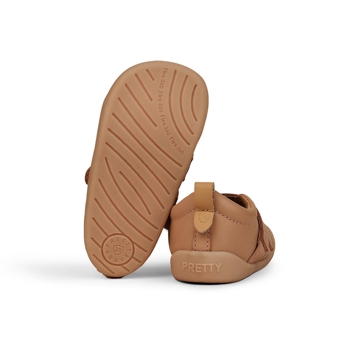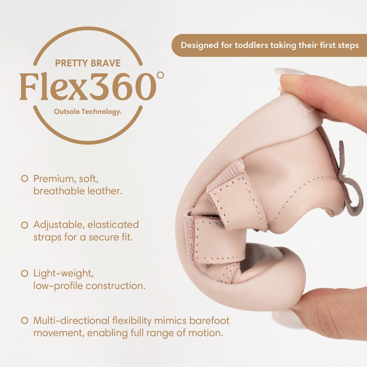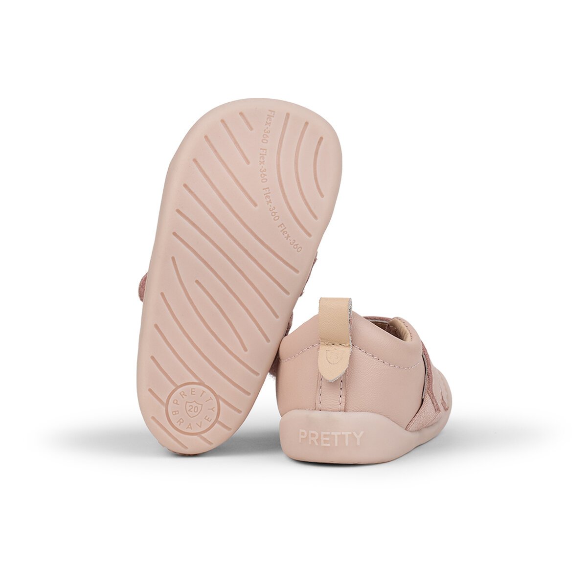 Part of the all-new Pretty Brave Toddler Range comes Toto - designed to support little ones as they take their very first steps. Created especially for the crawling-to-walking stage, Toto is crafted from premium leathers and features a lightweight, flexible design that moves with growing feet. The custom Flex 360 degree outsole promotes natural movement, splaying and comfort, while padded ankle support and double Velcro straps ensure a secure fit. With easy foot access and a secure fit, this style helps make the step from crawler to walker that much easier.