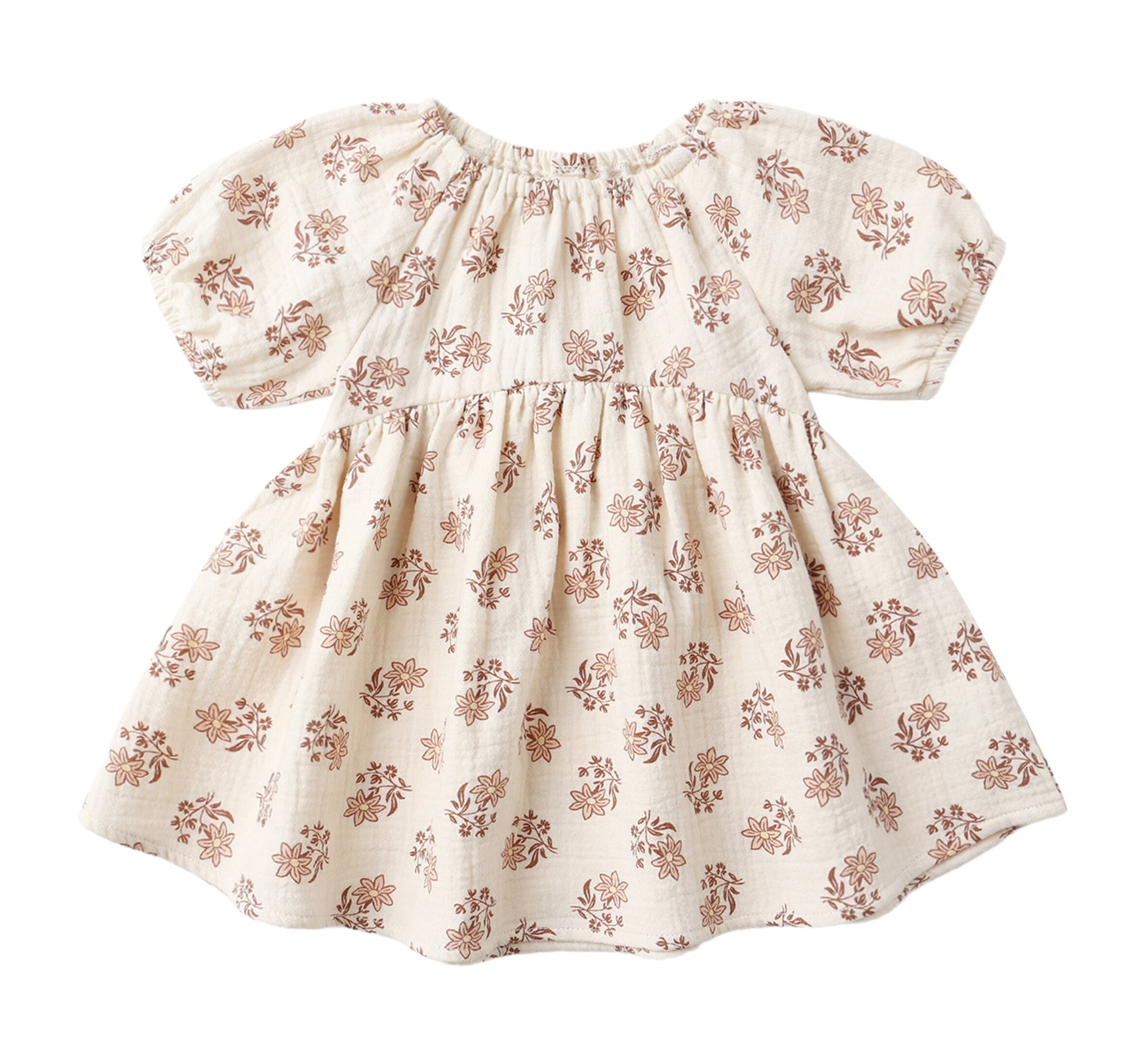 The Quincy Mae Bella Dress features an arched empire waist, a full gathered skirt, balloon sleeves, and a soft, stretchy neckline for an easy, comfortable fit. Coordinating bloomers included with sizes 0-3M - 2-3Y.