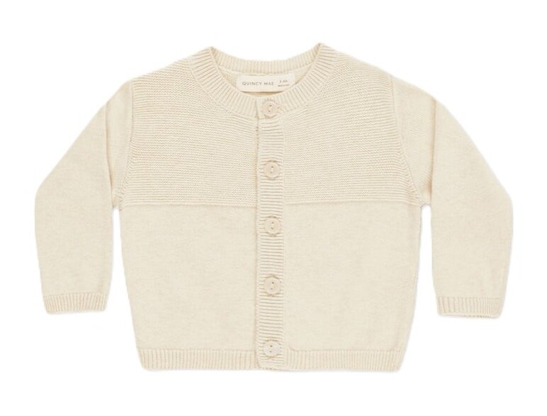 The Quincy Mae Knit Cardigan features a charming contrast knit design, with ribbing at the neck, wrists, and waist, with faux shell buttons for an extra sweet touch. Pair with our Knit Pant to complete your little one's look.
