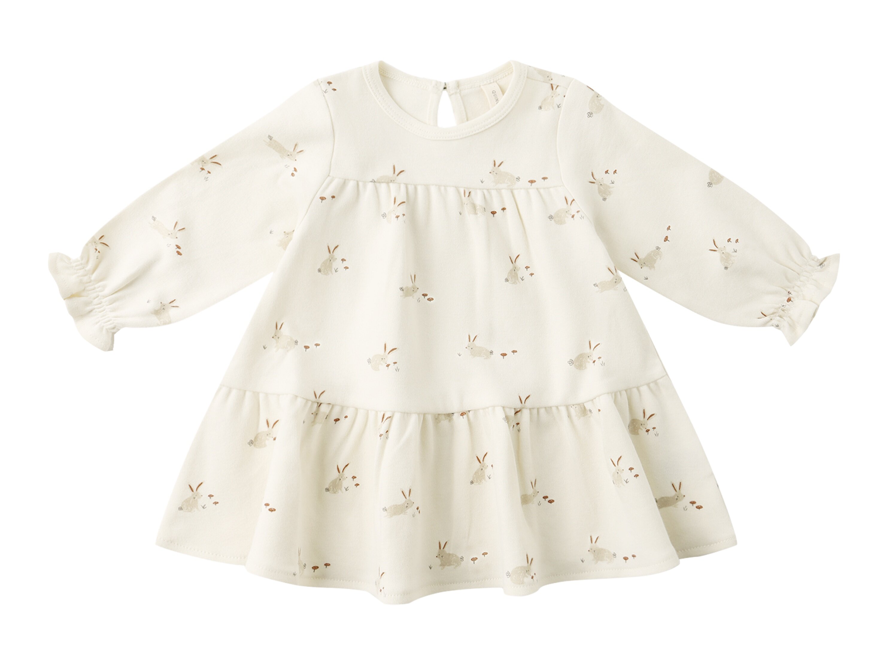 The Quincy Mae Tiered Jersey Dress is a long sleeve dress featuring soft tiered layers and a coconut button closure at the back. Coordinating bloomers included with all sizes.