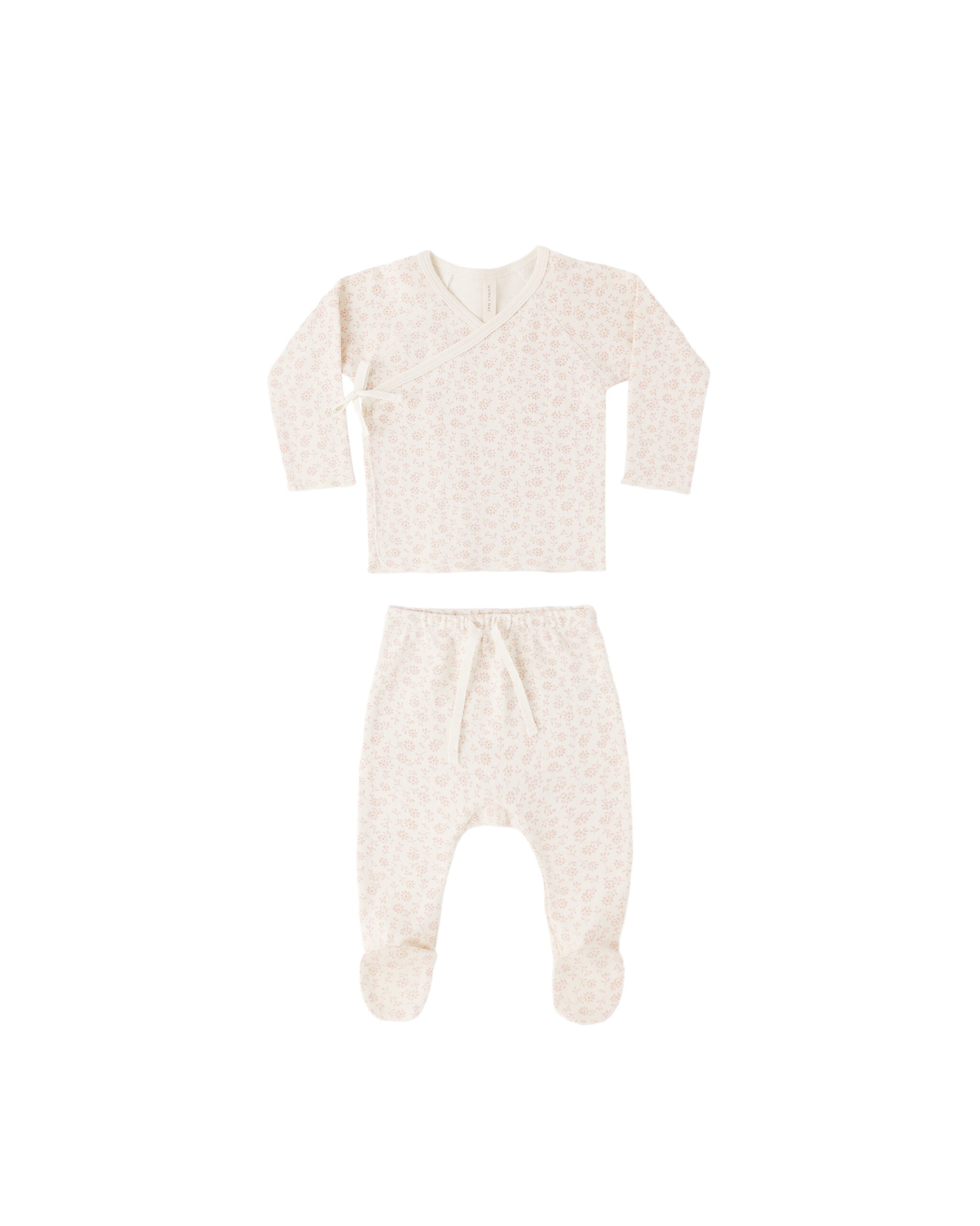 Bring home baby in the sweet Quincy Mae Wrap Top + Footed Pant set. Featuring Quincy Mae's long sleeve wrap top with inside snaps and side tie, and matching drawstring footed pants.