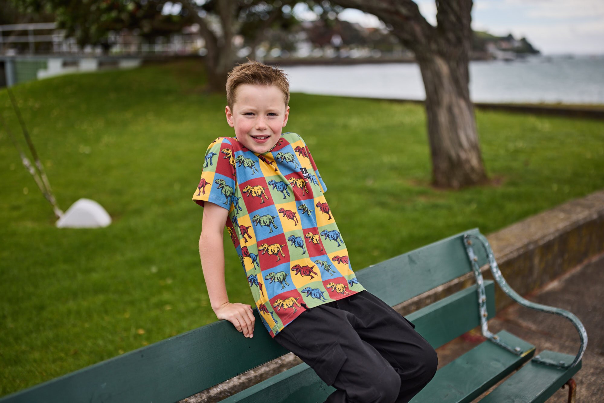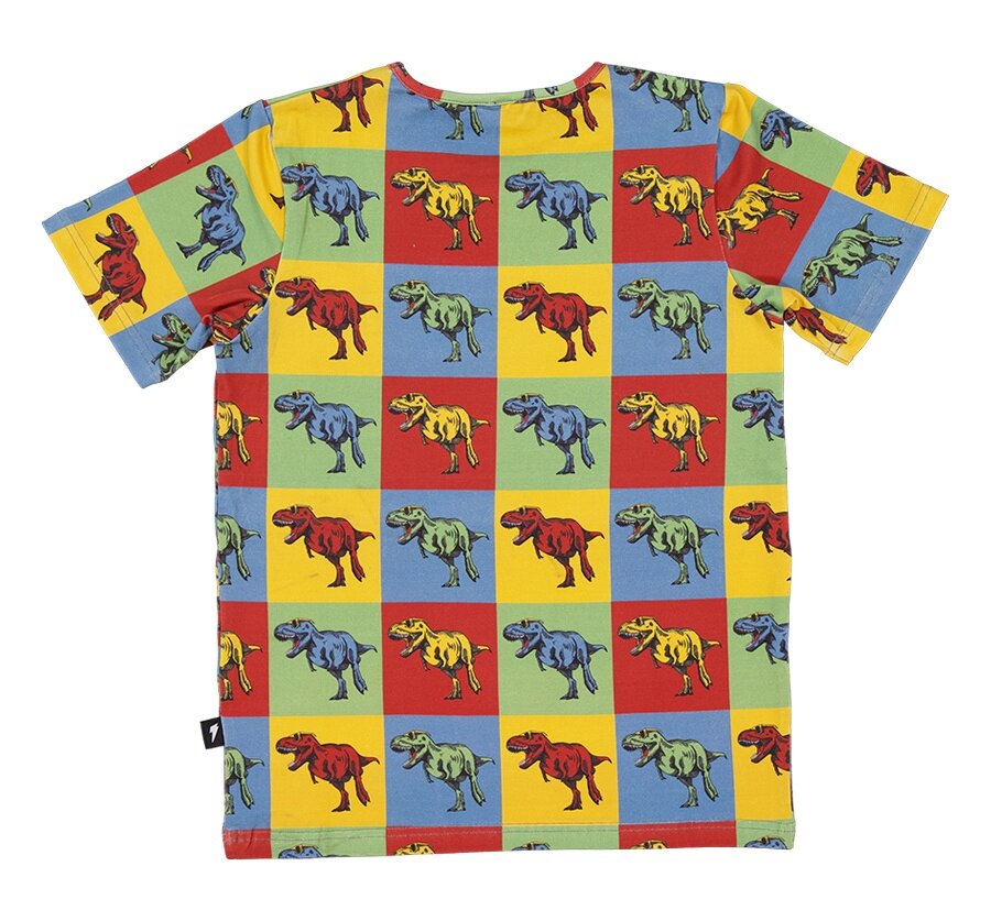 The Radicool Dino On Repeat Tee is an inspired pop-art pattern in bold colours that your dino-mad dude will want to wear and wear again!