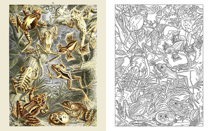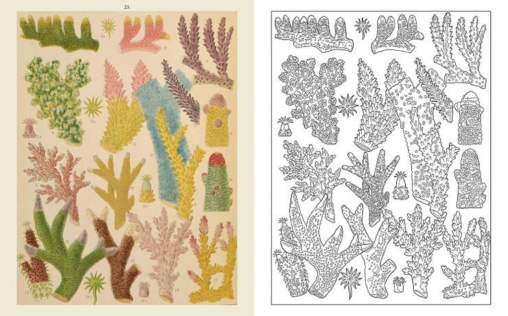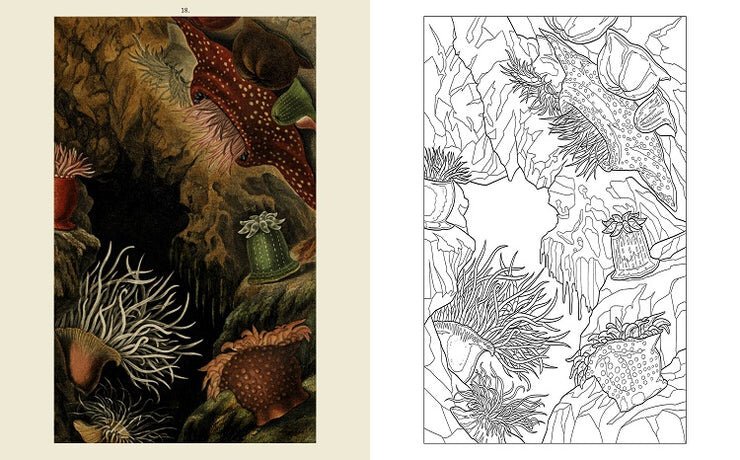 These artworks have been selected from some of the earliest illustrated books published on the natural history of the oceans, including The Great Barrier Reef of Australia by William Saville-Kent, The Naturalist's Miscellany by George Shaw and Ocean Gardens by H. Noel Humphreys. These original illustrations a shown in full-colour beside black and white line versions rendered by Diego Vaisberg to be filled with colour.