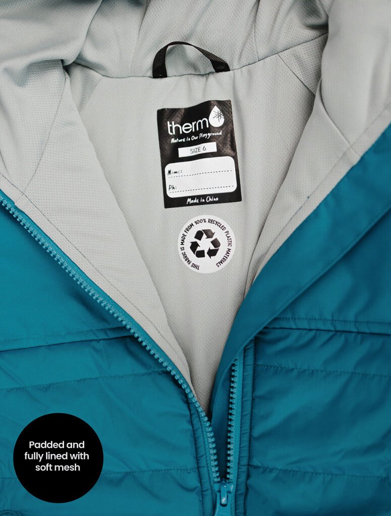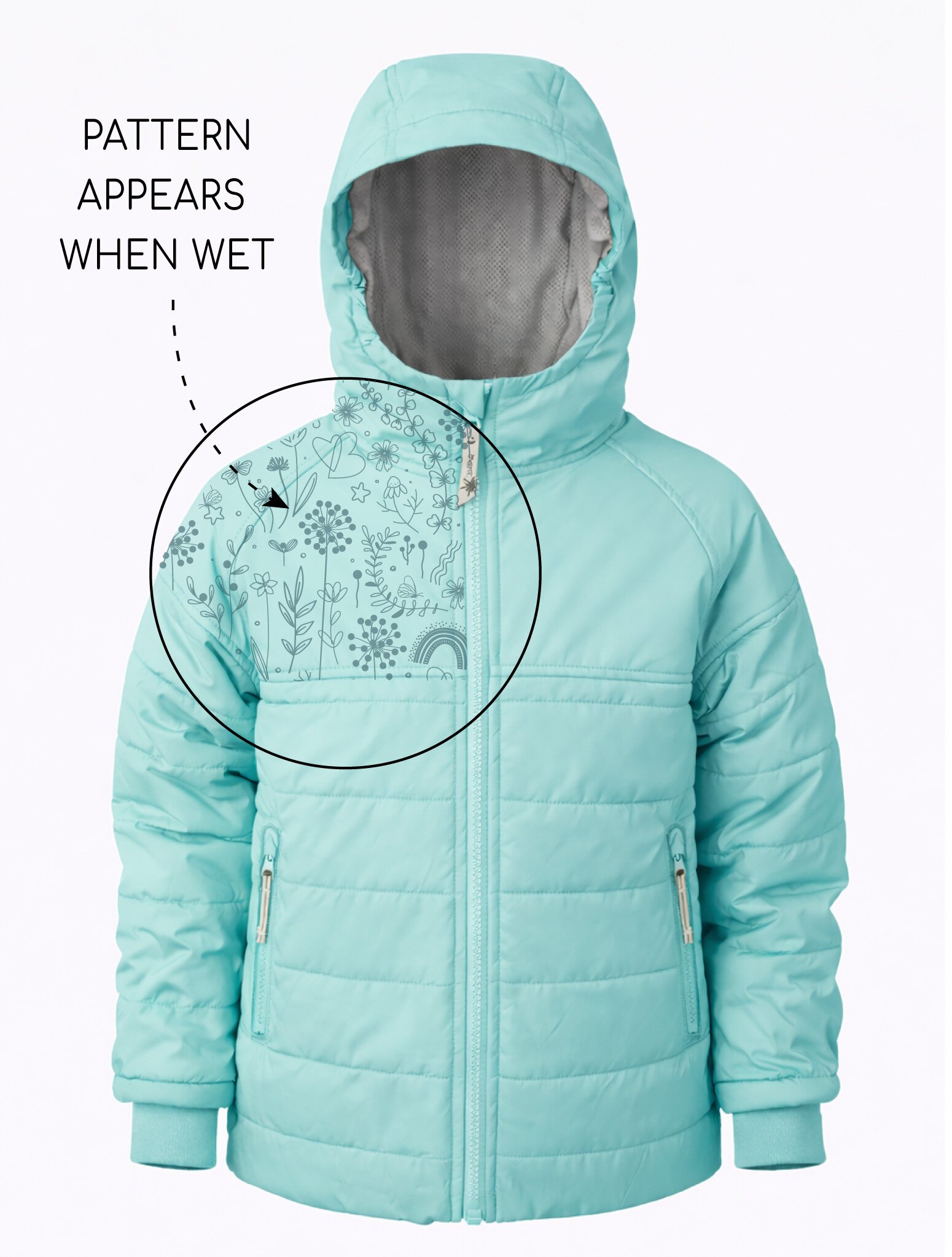 The Therm Hydracloud Puffer Jacket features a full waterproof (hydra) and windproof outer combined with ultra-soft cloud-like comfort. Providing midweight warmth and protection in wind, rain and snow, and lined with soft-touch jersey mesh for a cosy feel inside. And when the puffer gets wet, a secret pattern is revealed! See the SplashMagic pattern appear in the rain then disappear again when dry. Fun for toddler and big kids alike!
