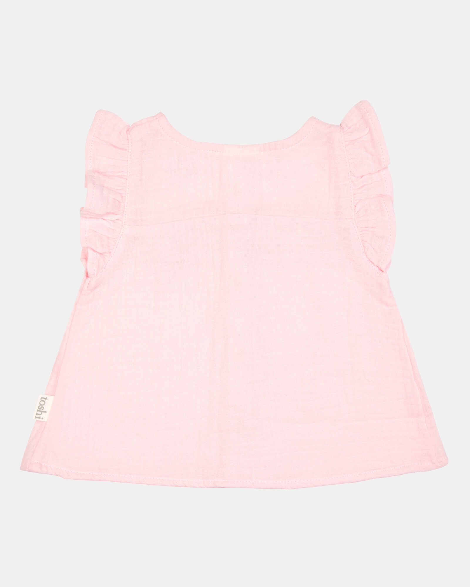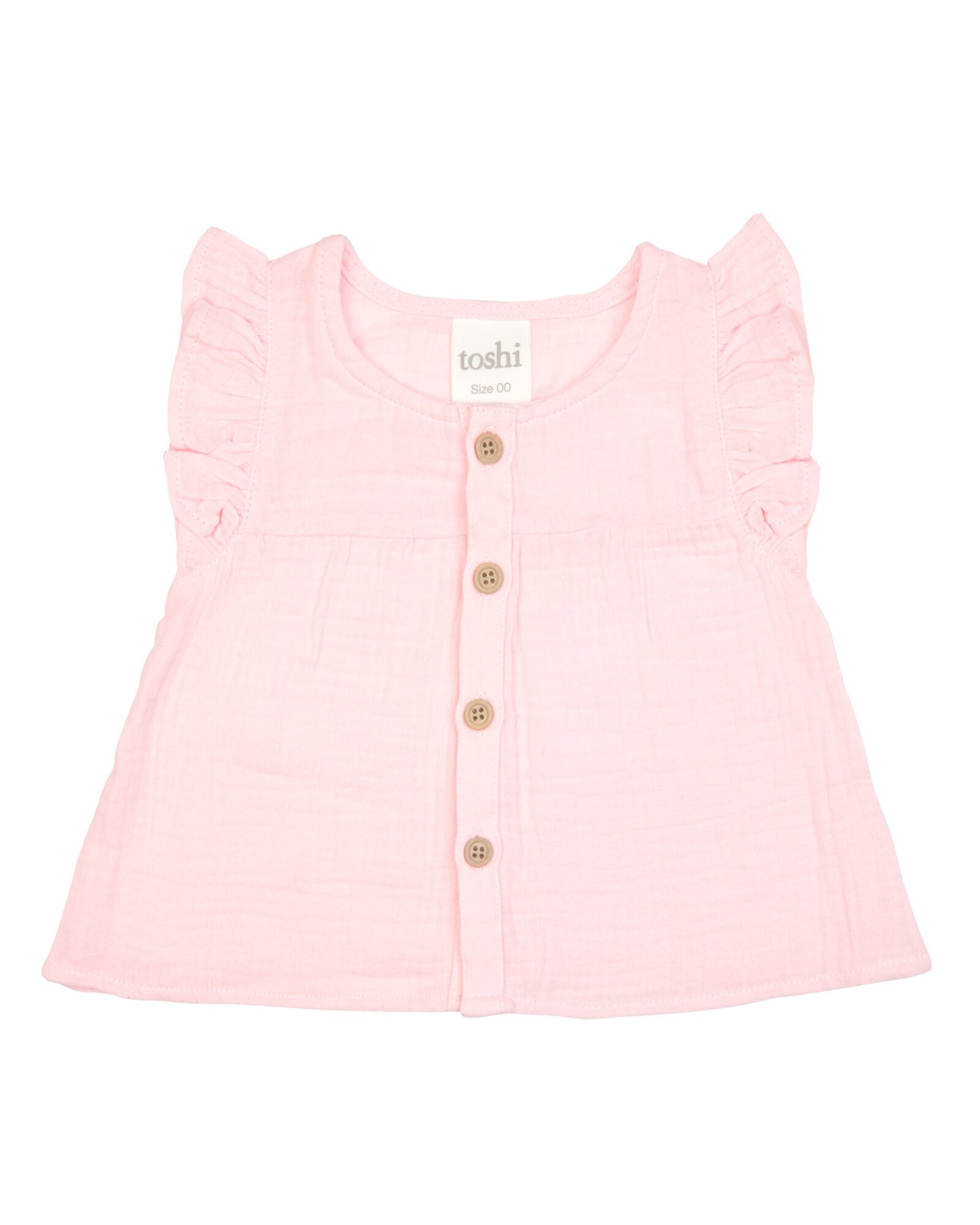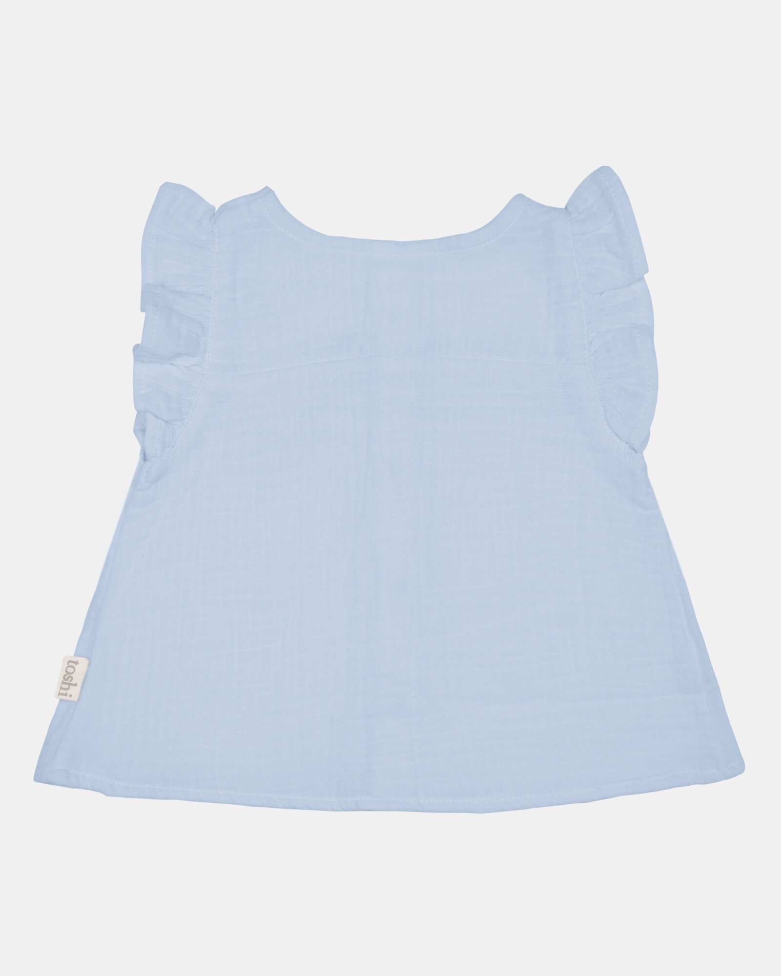 Toshi Top Frilled Sammy is crafted from the finest quality certified 100% organic cotton yarn. The cheesecloth fabrication features a supremely soft and gently nurturing texture. The classic colours create wardrobe staples, and are ideal for layering and transeasonal styling. The A-line shape is flattering and comfortable, with space for freedom of movement. Feature frill creates a playful and charming touch. The Toshi Top has front-opening press studs for easy dressing and undressing. The beautiful Toshi Baby Top transitions effortlessly from casual occasions to special celebrations.