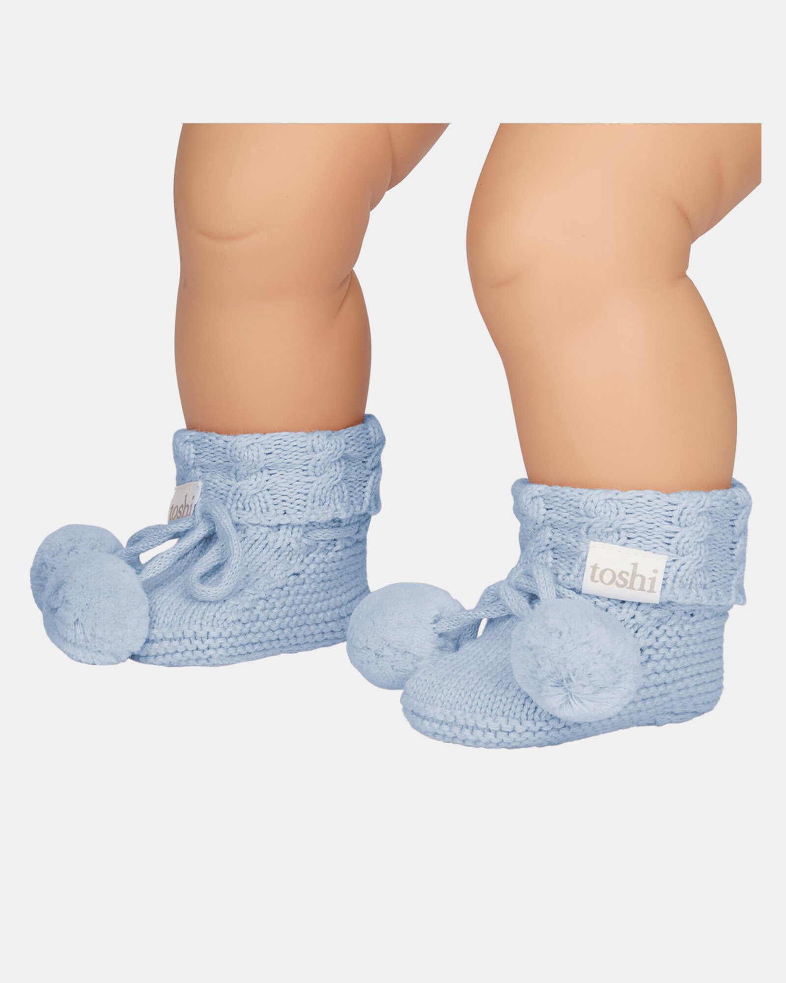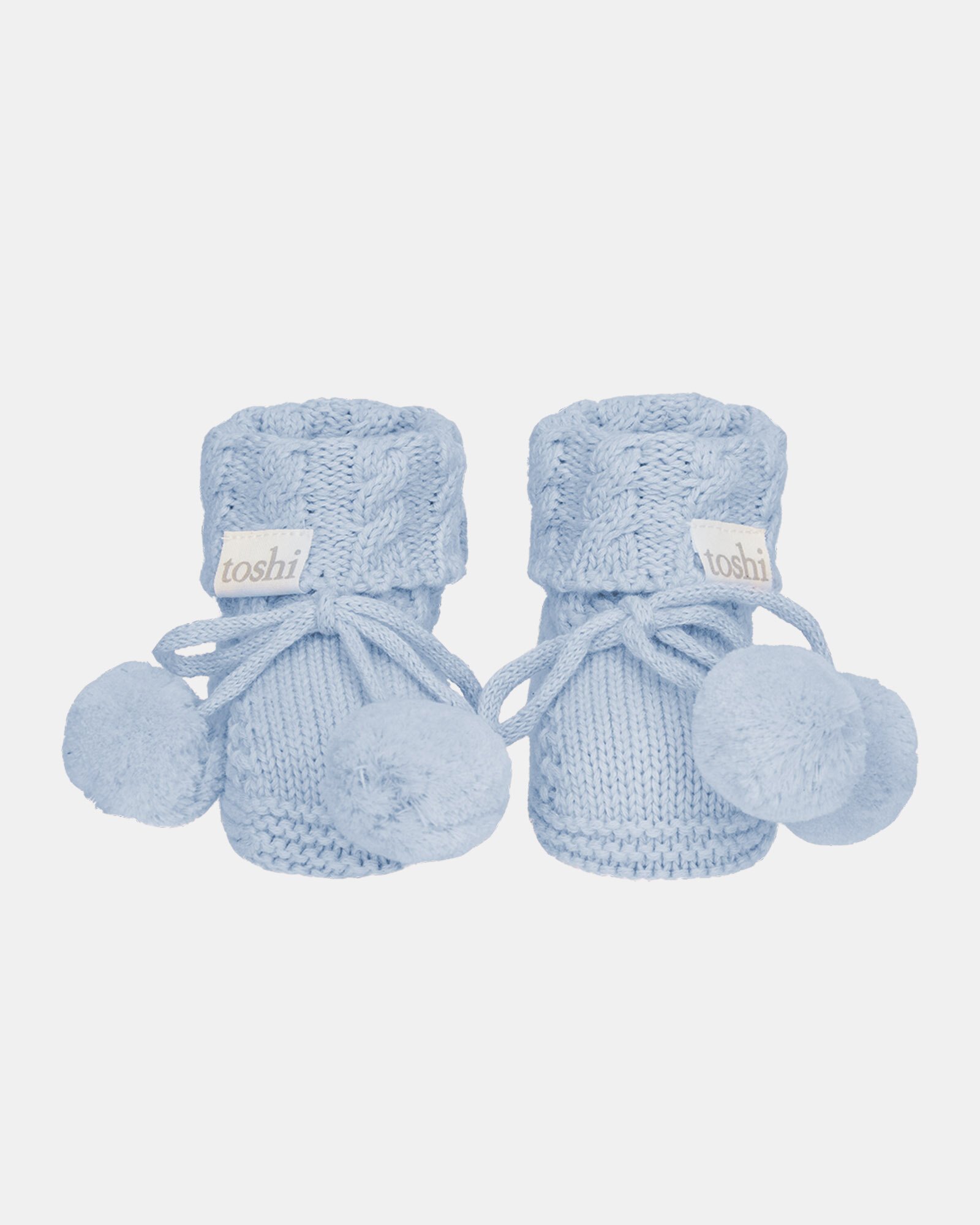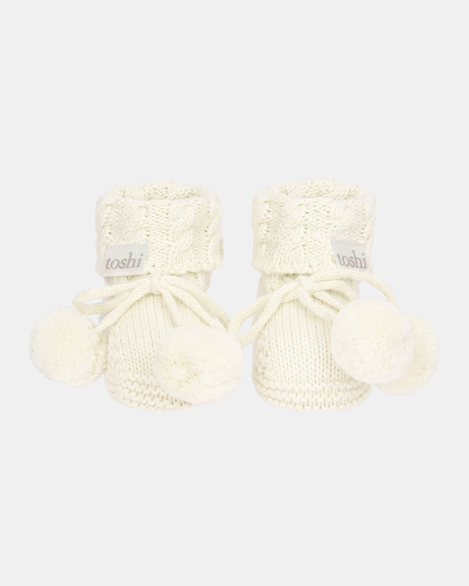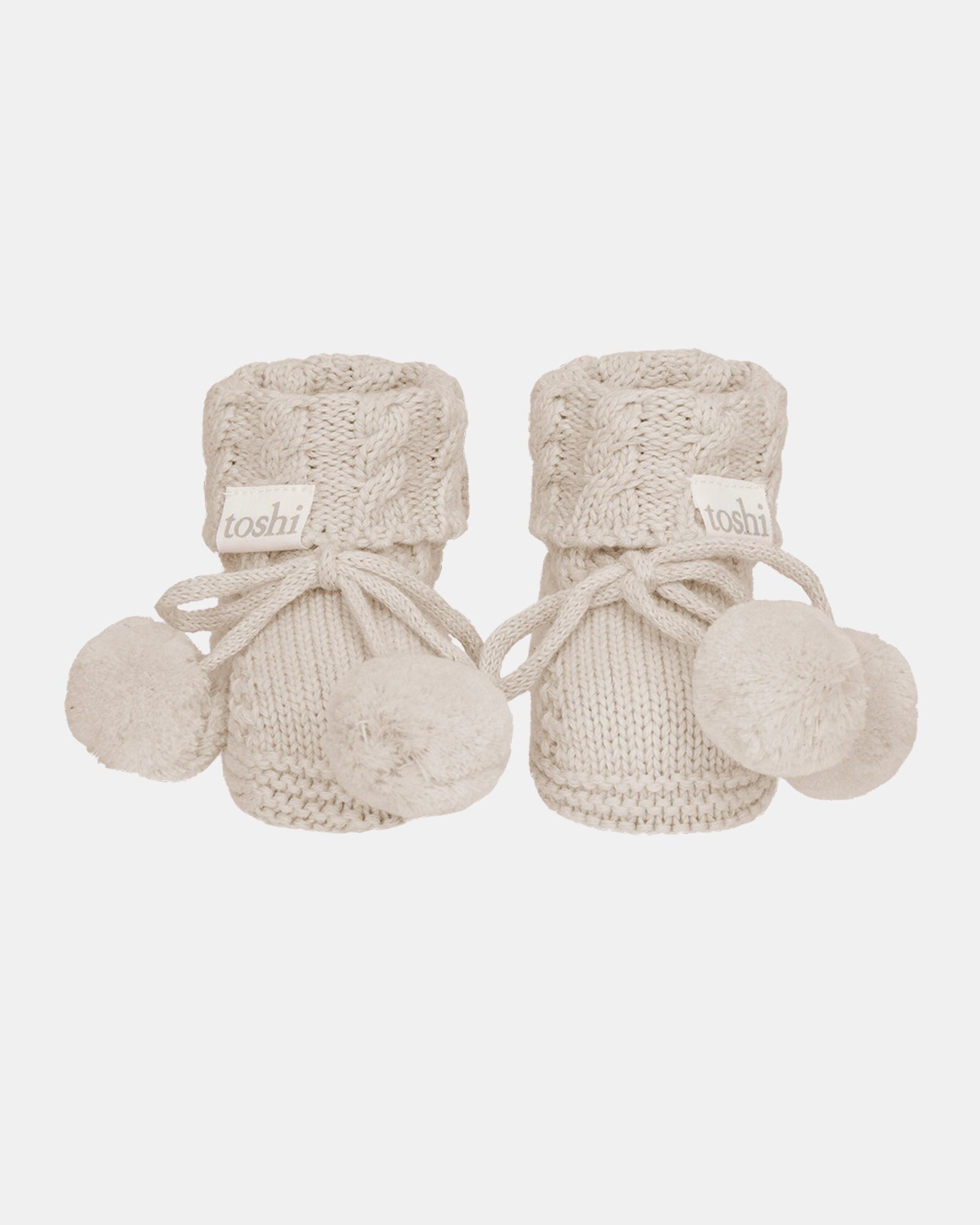 Beautifully textured melange yarn introduces a handcrafted feel and a level of natural refinement to this cosy and nurturing Toshi baby accessory. Chunky cable knit creates a cottage craft look. Cute pompoms adorn each bootie, adding a playful and whimsical touch. Adjustable ties provide a secure and comfortable fit, while ribbed knit cuffs help maintain the booties' position on tiny ankles.