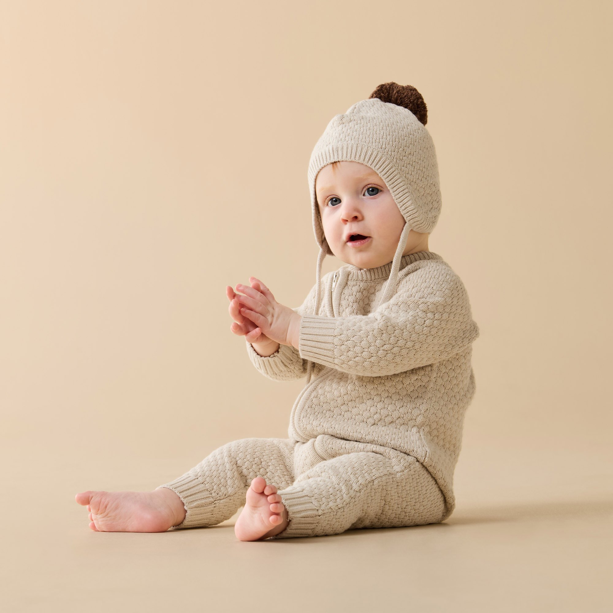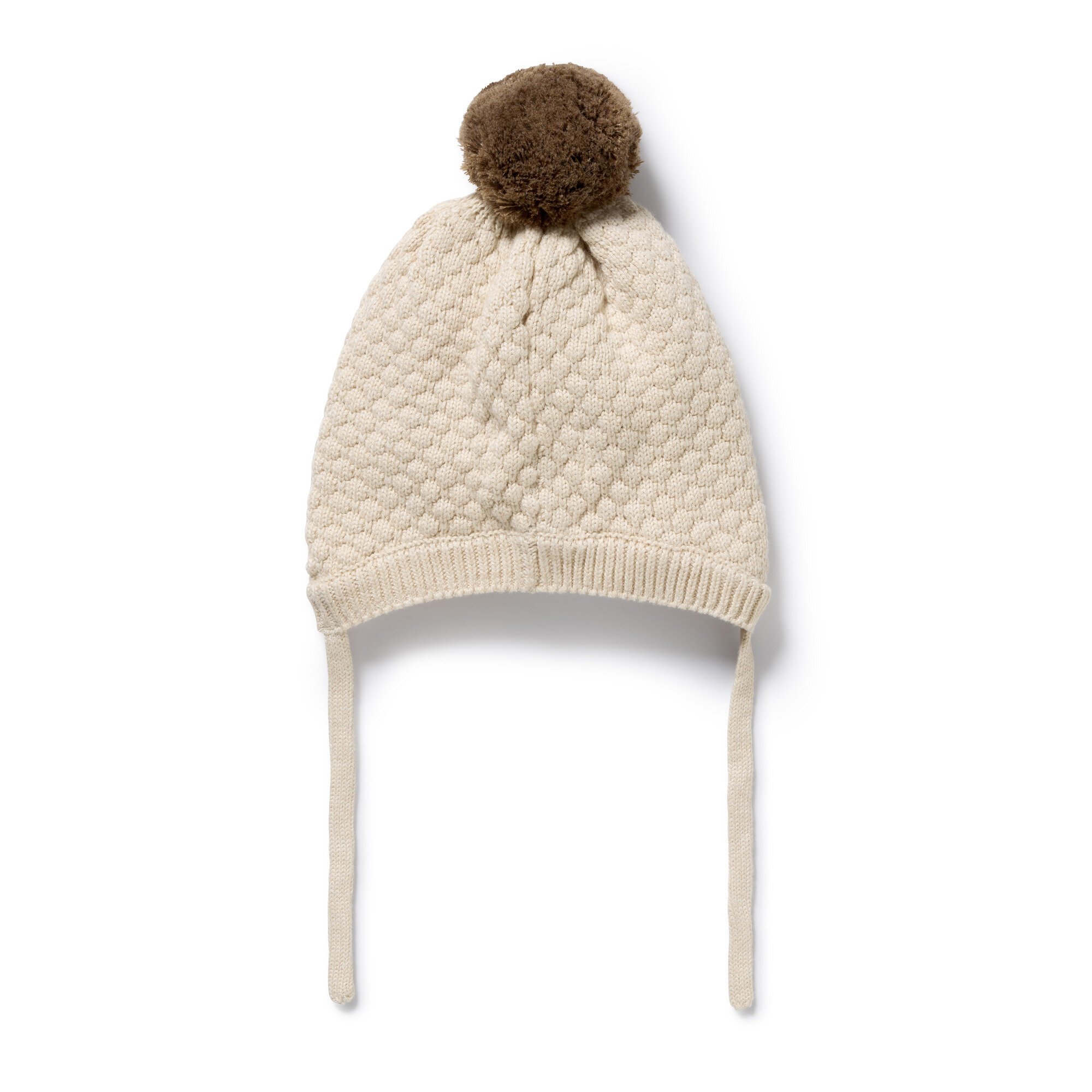 Keep your little one warm and snug in this Wilson and Frenchy bubble knit baby bonnet. Crafted from a luxurious blend of organic cotton, bamboo, and wool, this soft and breathable knit bonnet is designed to gently cover your baby head and ears. The bubble texture adds a sweet touch, while soft ties under the chin ensure it stays securely in place. A cosy essential for cooler days.