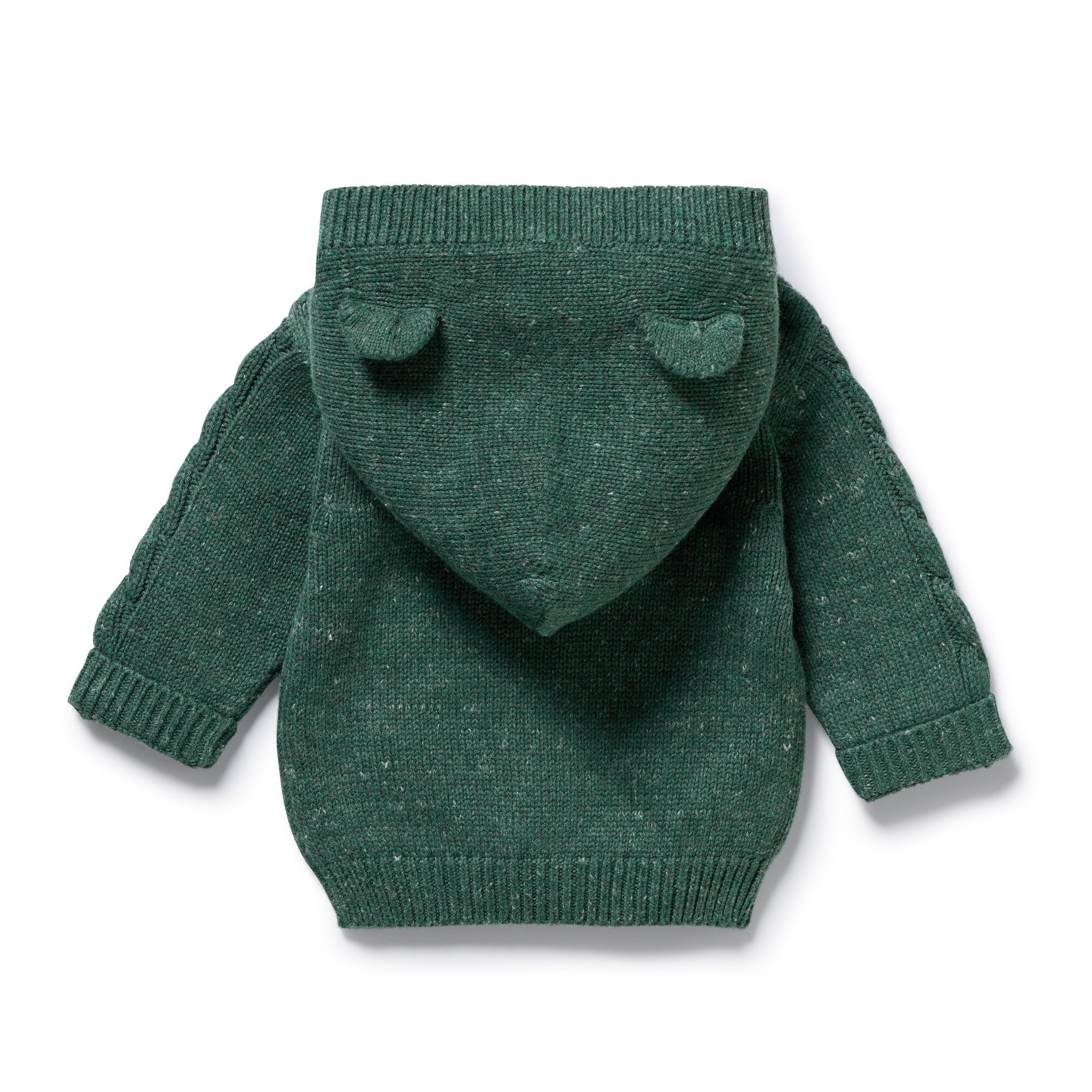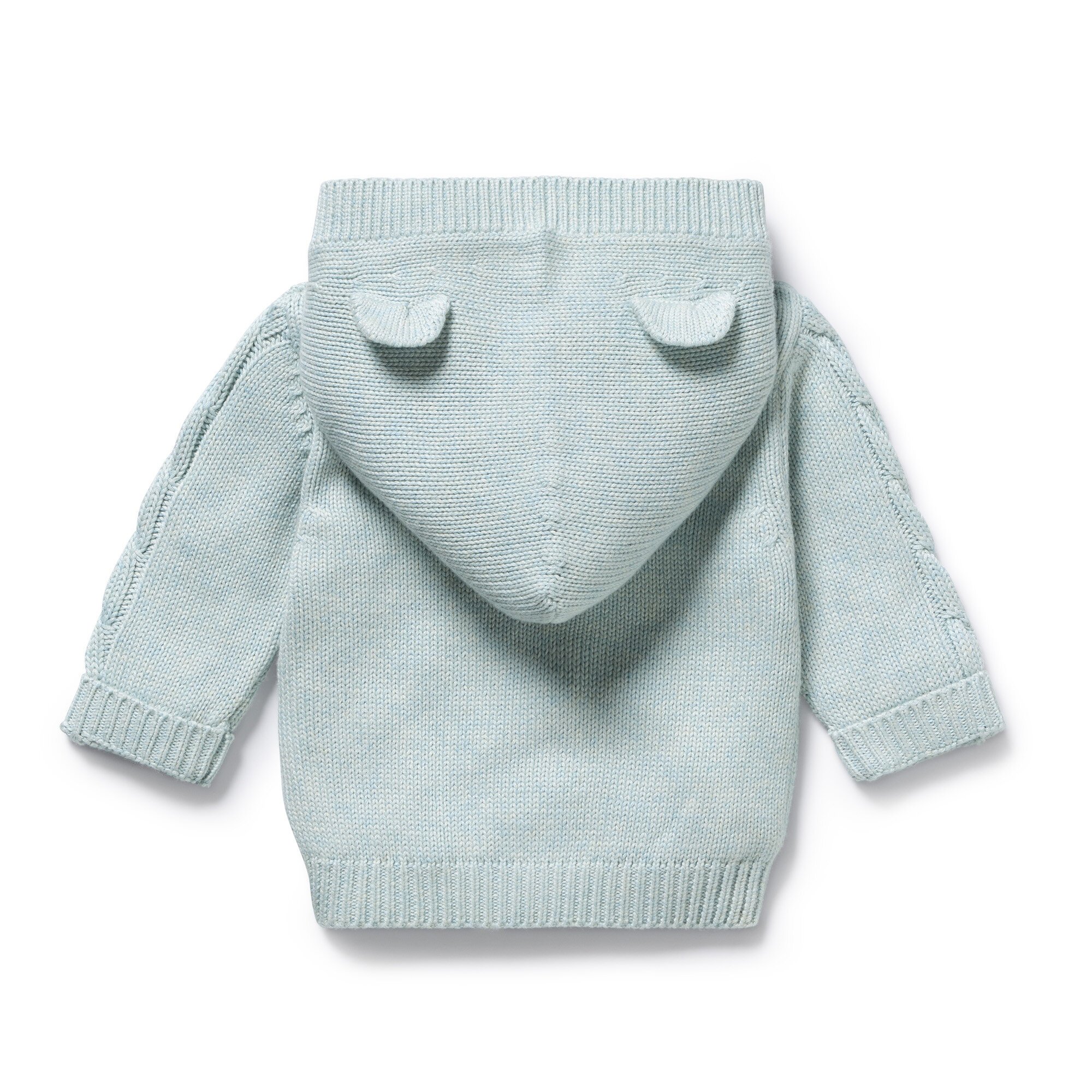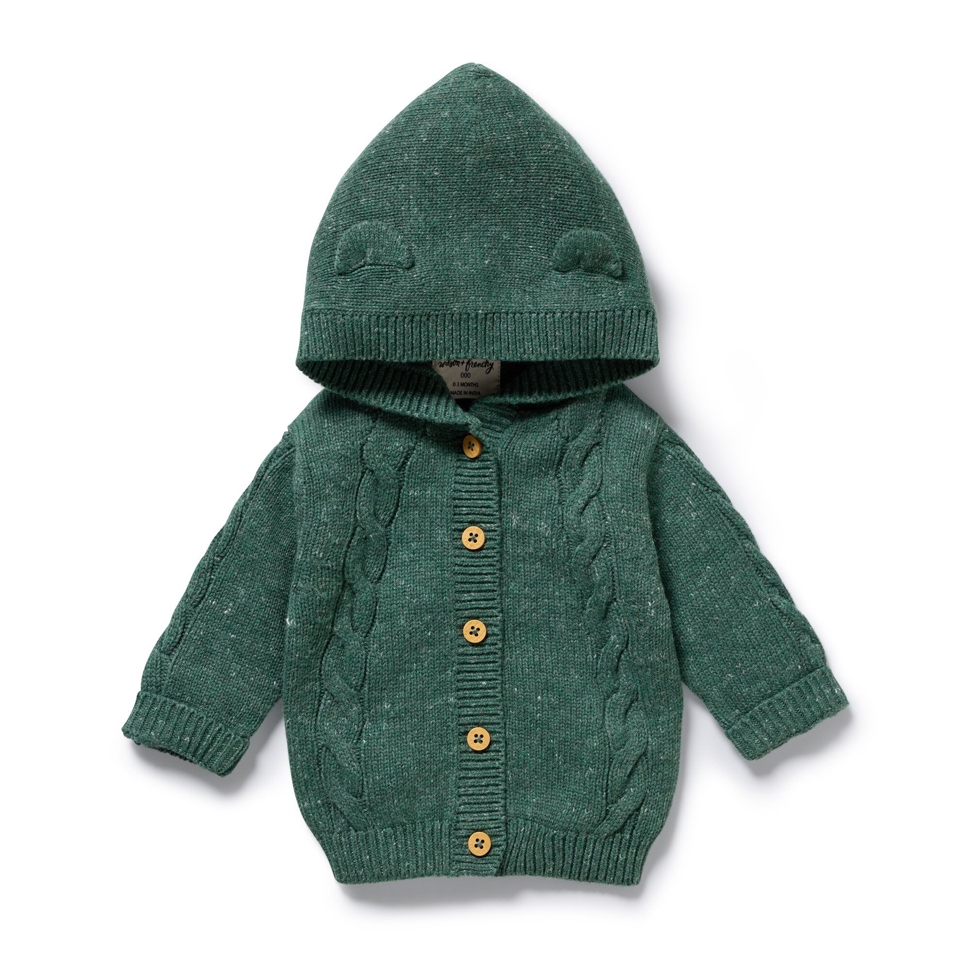 Introducing this cosy knitted jacket by Wilson and Frenchy with a hood and adorable bear ears. Made of a luxurious blend of organic cotton, bamboo, and wool, this jacket features a button front opening and a cable design on the front. Stay warm this winter with our baby-friendly design.