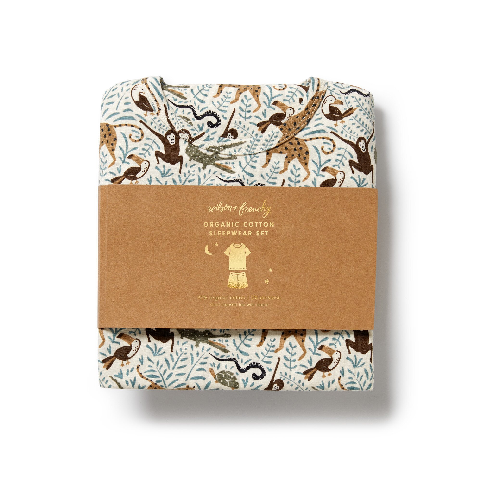 This Wilson & Frenchy mini jungle organic short sleeved pyjama set is made from the softest organic cotton pointelle and features an all over print, you can be rest assured that your child is sleeping in softest most comfortable sleepwear around. This set comes with a fitted short sleeved tee and mid-length loose fitted short.